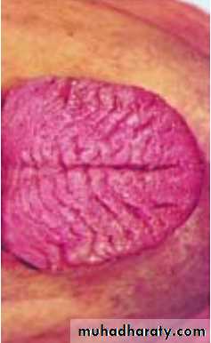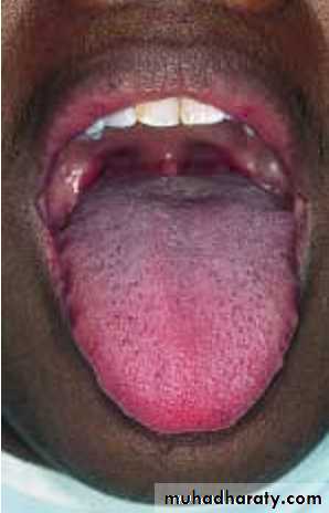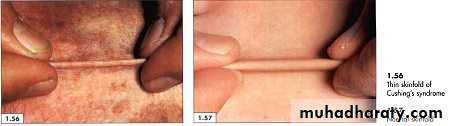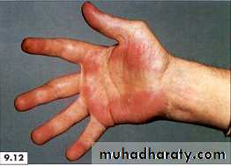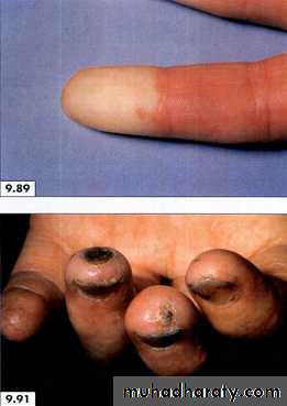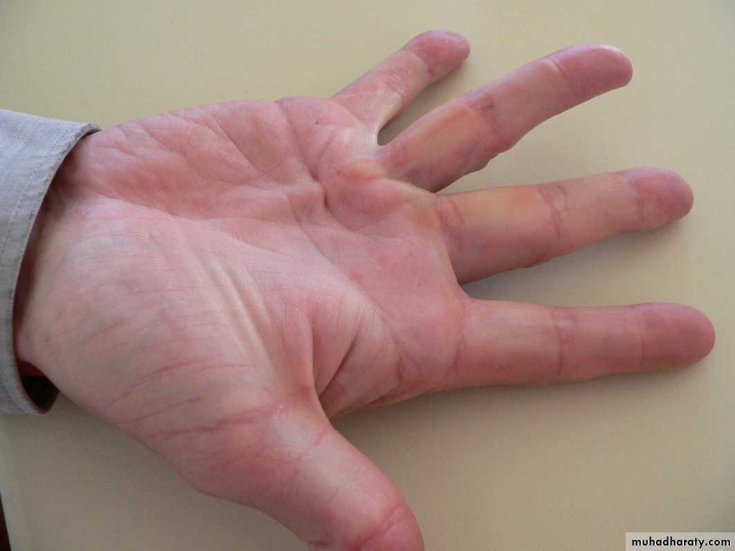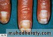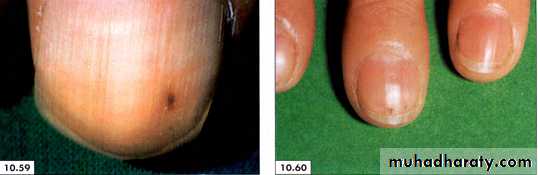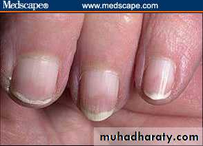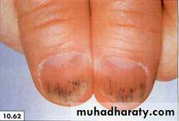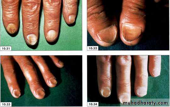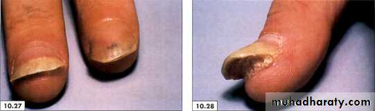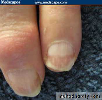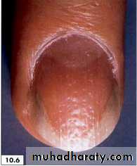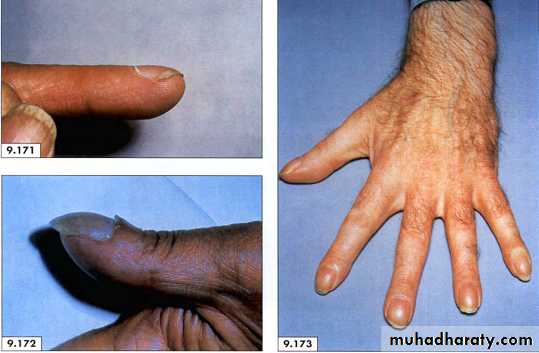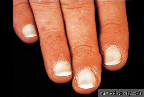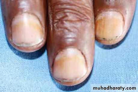 Clubbing:thickened nail bed raising the root of the nail which is in a straight linewith the finger