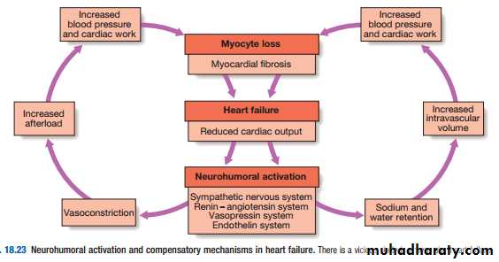 Cardiac output is determined by preload (the volume and pressure of blood in the ventricles at the end of diastole), afterload (the volume and pressure of blood in the ventricles during systole) and myocardial contractility; this is the basis of Starling’s Law.In patients without valvular disease, the primary abnormality is impairment of ventricular myocardial function, leading to a fall in cardiac output. This can occur because of impaired systolic contraction, impaired diastolic relaxation, or both. This activates counterregulatory neurohumoral mechanisms that, in normal physiological circumstances, would support cardiac function but, in the setting of impaired ventricular function, can lead to a deleterious increase in both afterload and preload