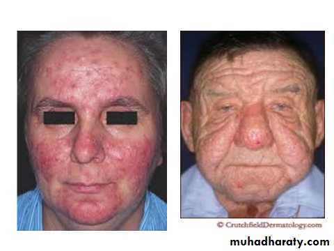 (latin: “like roses”) is a chronic inflammatoy disorder of the facial pilosebaceous units, with an increased reactivity of capillaries to heat, leading to flushing and telangiectasia...Clinically