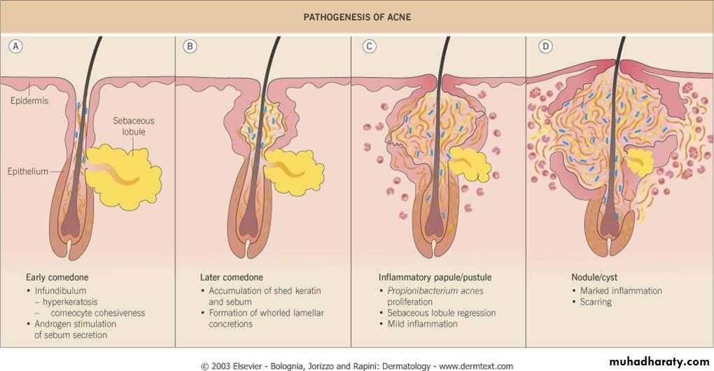 The abnormal keratinaceous material and sebum collect in the microcomedon. (So commedon formed which is non-inflammatory acne)
