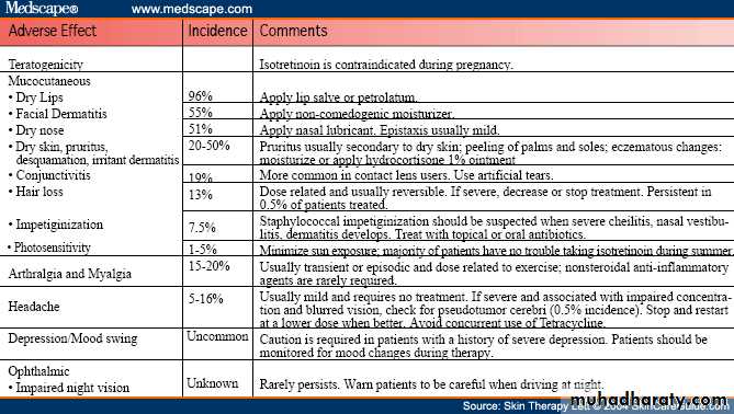 Teratogenic (contraindicated to be pregnant)Dryness of skin and mucous membrane (lip, face, and body nose – bleeding)
