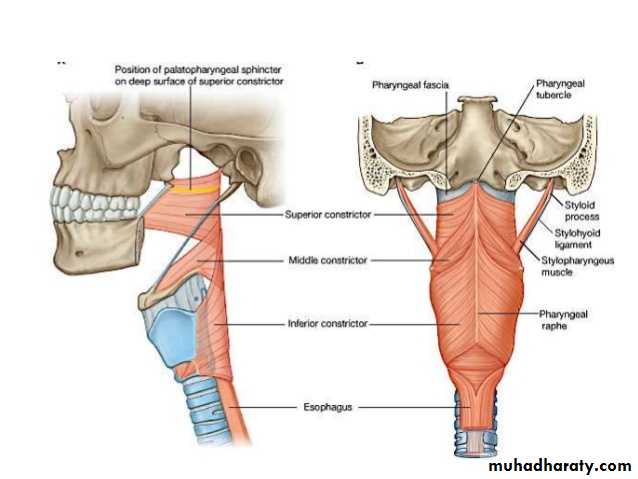 The muscles in the wall of the pharynx consist of the superior, middle, and inferior constrictor muscles, whose fibers run in a somewhat circulardirection, and the stylopharyngeus and salpingopharyngeus muscles, whose fibers run in a somewhat longitudinal direction.The three constrictor muscles extend around the pharyngeal wall to be inserted into a fibrous band or raphe that extends from the pharyngeal tubercle on the basilar part of the occipital bone of the skull down to the esophagus. The three constrictor muscles overlap each other so that the middle constrictor lies on the outside of the lower part of the superior constrictor and the inferior constrictor lies outside the lower part of the middle constrictor.