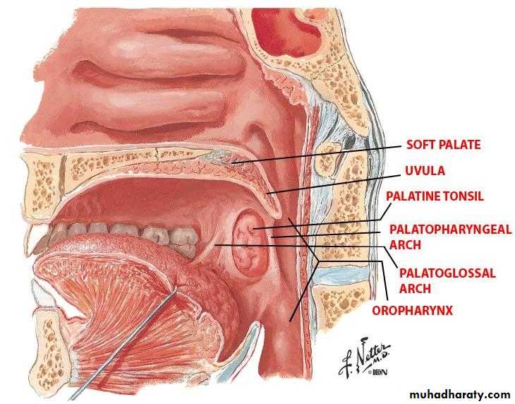 -Palatopharyngeal arch: folds of mucous membrane that pass downward from the posterior margin of the soft palate to the lateral wall of the pharynx. It encloses the palatopharyngeus muscle and forms the posterior margin of the tonsillar fossa.
