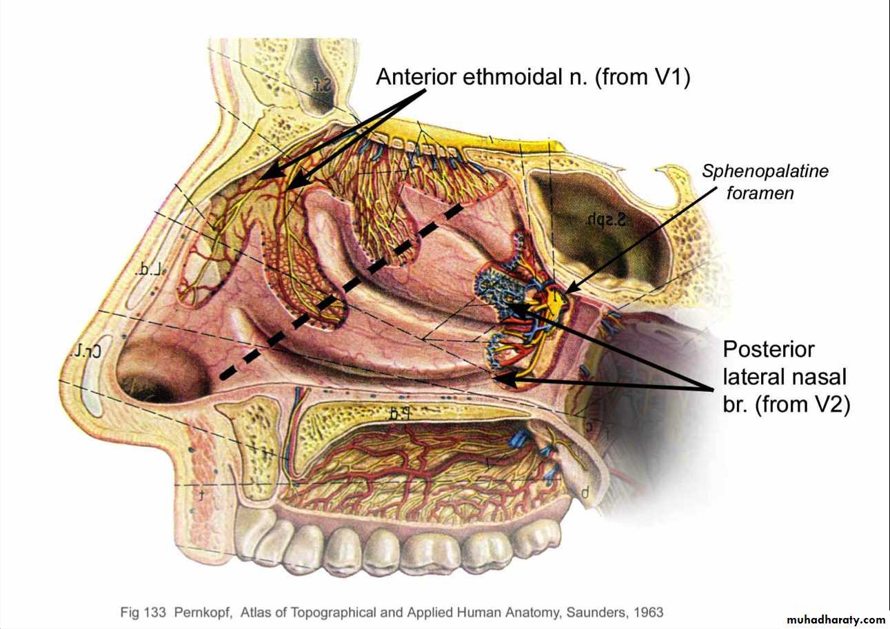 • 2. ophthalmic nerve by way of the anterior and posterior ethmoidal nerves, branches of the nasociliary nerve.