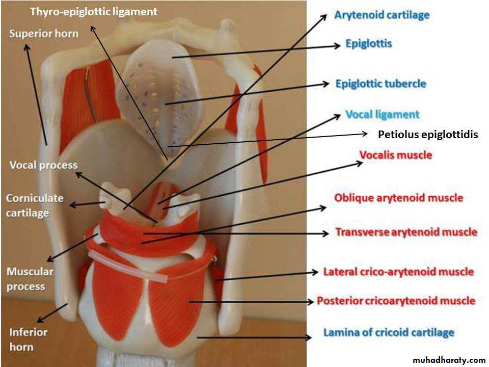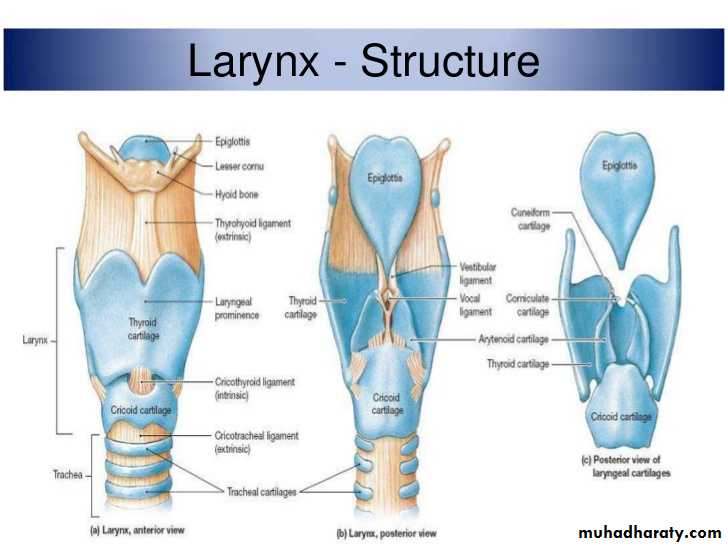 Larynx: The larynx is a tough, flexible segment of the respiratory tract connecting the pharynx to the trachea in the neck. It plays a vital role in the respiratory tract by allowing air to pass through it while keeping food and drink from blocking the airway. The larynx is also the body’s “voice box” as it contains the vocal folds that produce the sounds of speech and singing. It opens above into the laryngeal part of the pharynx, and below is continuous with the trachea. The larynx is covered in front by the infrahyoid strap muscles and at the sides by the thyroid gland.The framework of the larynx is formed of cartilages that are held together by ligaments and membranes, moved by muscles, and lined by mucous membrane.