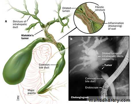 Primary sclerosing cholangitis Is a cholestatic liver disease caused by diffuse inflammation and fibrosis that can involve the entire biliary tree and leads to the gradual obliteration of intrahepatic and extrahepatic bile ducts, and ultimately biliary cirrhosis, portal hypertension and hepatic failure. Cholangiocarcinoma develops in about 10-30% of patients during the course of the disease. About two-thirds of patients with primary sclerosing cholangitis have coexisting ulcerative colitis.