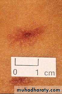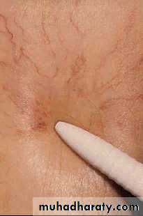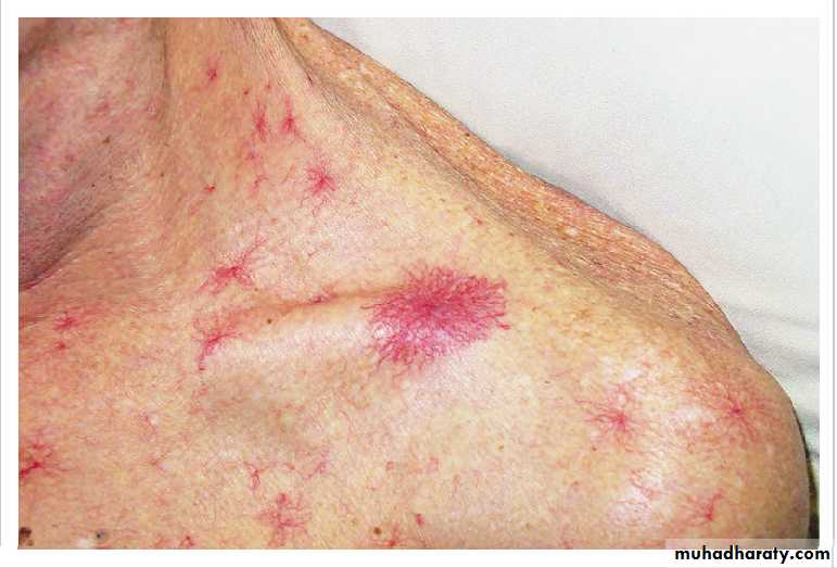 Spider telangiectasias occur and comprise a central arteriole (which occasionally raises the skin surface), from which small vessels radiate. They vary in size from 1 to 2 mm in diameter, are usually found only above the nipples, and can occur early in the disease.