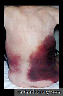 She tell you that she has poor appetite, and has weight loss. She bruises easily with cutaneous signs of chronic liver disease, ascites and peripheral edema on examination. There is no meleana on rectal examination.