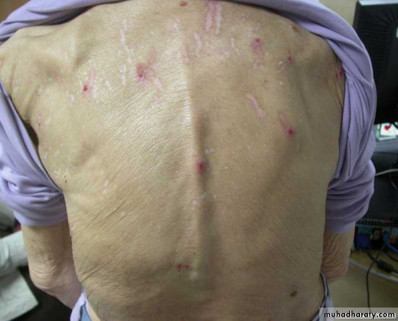 Pruritus: the patient scratched and excoriate areas of skin that can be reached.