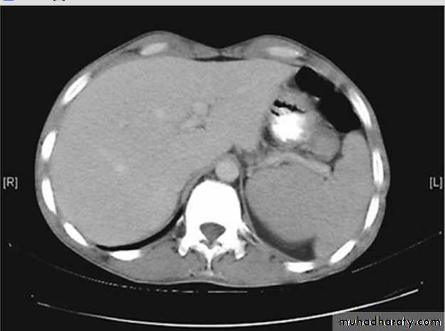 Normal liver on CT scan, with smooth liver contours; normal size of spleen.