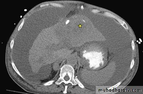 CT image of upper abdomen revealing cirrhotic liver with a large mass in left hepatic lobe (star) and massive ascites