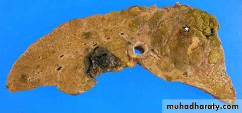 Cross-section of liver showing green-yellow hepatocellular carcinoma in left hepatic lobe (star).