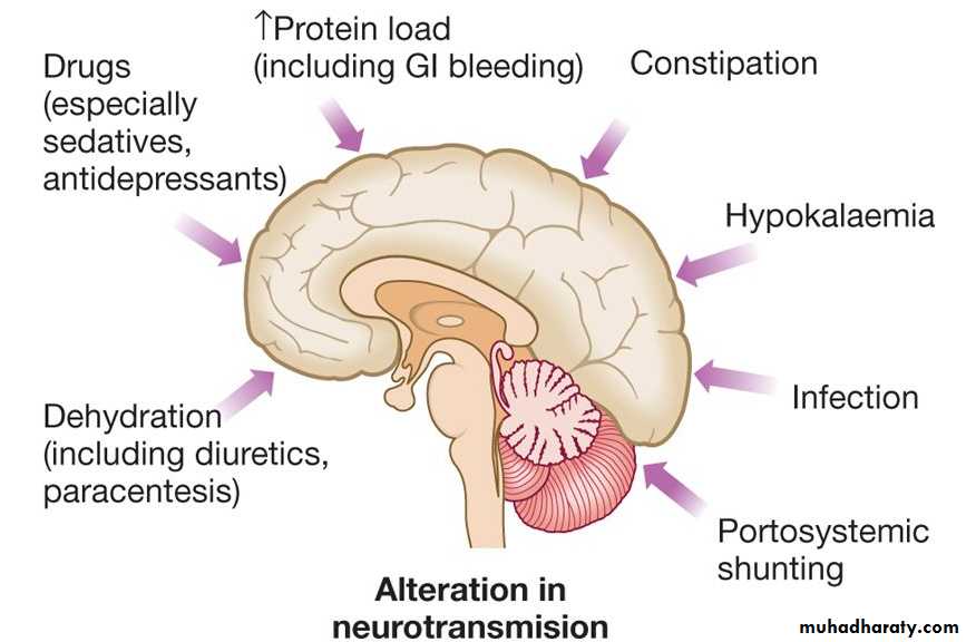 Inadequate hepatic removal of nitrogenous compound like ammonia, γ-aminobutyric acid, and mercaptans. Which pass through portosystemic shunting to CNS, lead to brain dysfunction and cerebral oedema .