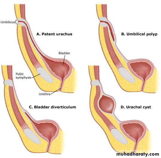 A connection between the urinary bladder and umbilicus usually presents in later life. This is due to increased pressure in the bladder as a result of obstruction from conditions such as prostatic hypertrophy. The cause of obstruction should be dealt with initially but if the problem persists then surgical excision of the patent urachus might be considered.