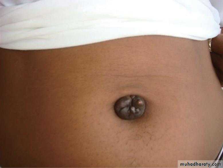 In normal patients, the umbilicus is connected to the liver, bladder and gynaecological organs by various ligaments. Diseases of these organs, such as infection or malignancy, can extend along these ligaments to appear at the umbilicus as a mass or fistulous discharge. E.g sister joseph’ nodule