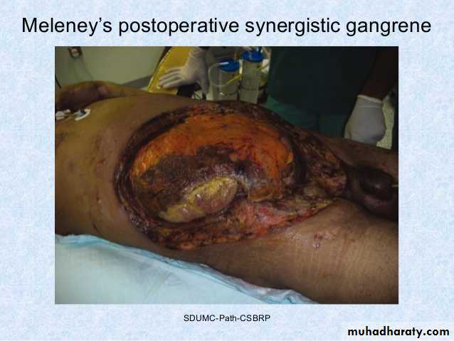 Meleney’s synergistic gangrene(abdominal wall) and Fournier’s gangrene(perineum) are all variants of a similar disease process.