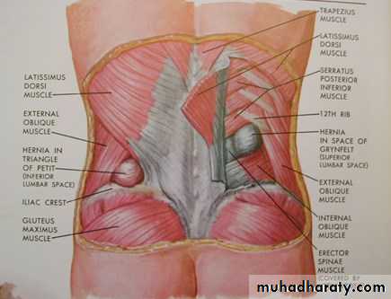Most primary lumbar hernias occur through the inferior lumbar triangle of Petit bounded below by the crest of the ilium, laterally by the external oblique muscle and medially by the latissimus dorsi.Less commonly, through the superior lumbar triangle, which is bounded by the 12th rib above, medially by the erector spinalis and laterally by the posterior border of the internal oblique muscle.