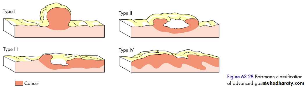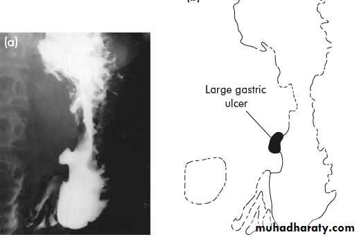 Invade mucosa & muscle coat & fibrosis may cause stomach deformity: hour glass stomach or tea pot deformity, may penetrate to pancreas or blood vessel or invade transverse colon ..
