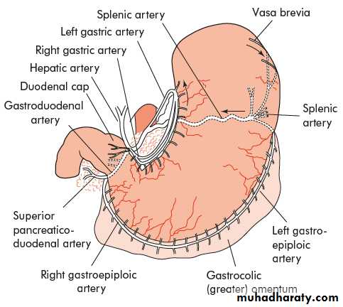 3- Gastroduodenal artery ( from hepatic artery) divide into a –superior pancreaticoduodenal A., b- right gastroepiploic artery.