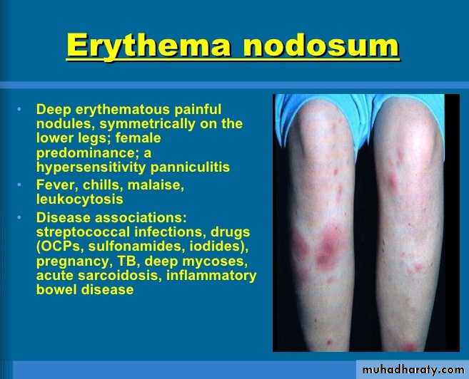 Skin lesions: erythema nodosum, and pyoderma gangrenosum.