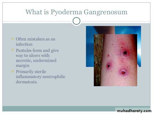 Erythema Nodosum: Deep painful erythematous nodules, symmetrical on both legsPyodermaganfrenosum