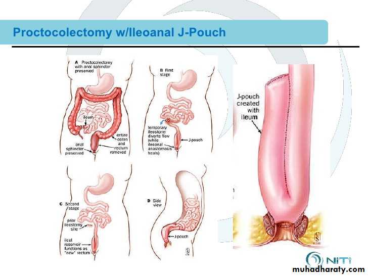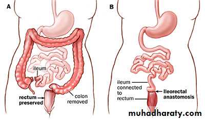Proctocolectomy and permanent ileostomy.Restorative Procto-colectomy with ileo-anal pouch anastamosis: