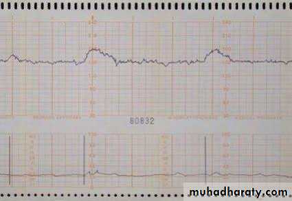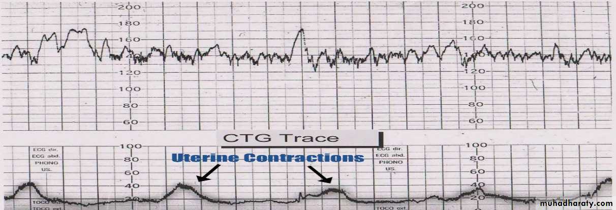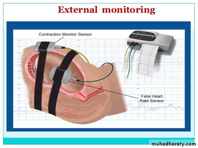 ►External cardiotocography CTG:- The fetal heart rate and the activity of the uterine muscle are detected by two transducers placed on the mother’s abdomen and recorded on a paper, it has two components: