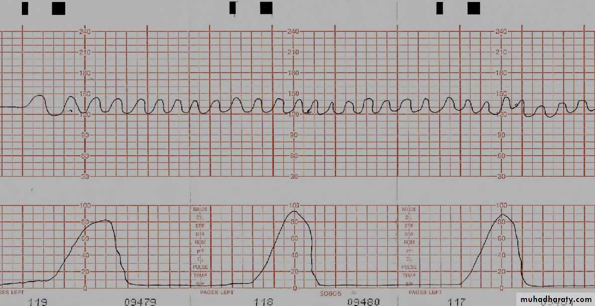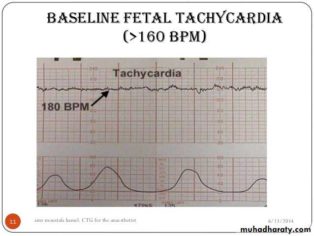This is the mean level of the most horizontal FHR segments and expressed in beats per minute (bpm). Normal baseline between 110-160 bpm.►Tachycardia: