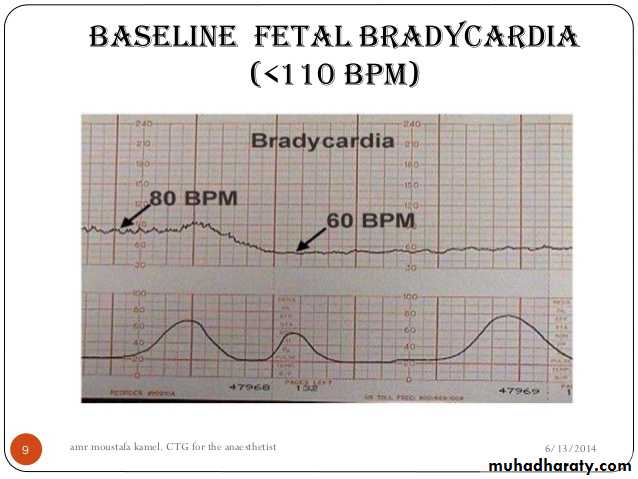 Baseline value below 110 bpm lasting more than 10 minutes. Causes:Cord compression\prolapse