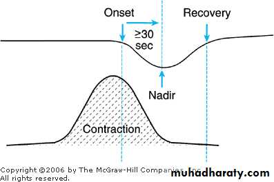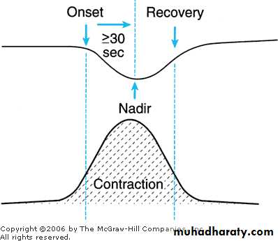 Decelerations with a gradual onset and\or a gradual return to the baseline (> 30 seconds). Late decelerations start after the peak of contraction, and return to the baseline after the end of contraction.