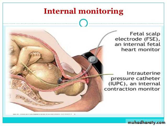 Fetal heart rate:uses an electronic transducer connected directly to the fetal scalp. A wire electrode is attached to the fetal scalp through the cervical opening (the membranes must be ruptured) and is connected to the monitor. Internal monitoring provides a more accurate and consistent transmission of the fetal heart rate than external monitoring by identifying R waves on the fetal ECG, but more expensive and invasive so may be used when external monitoring of the fetal heart rate is inadequate, or closer surveillance is needed.