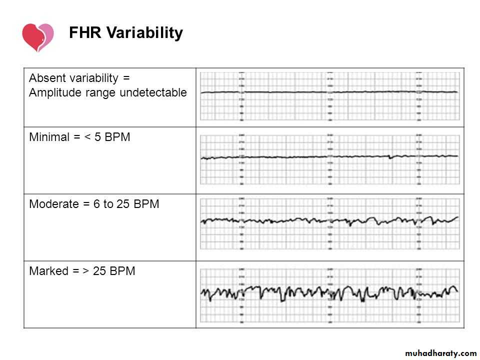 Normal variability (moderate variability): a bandwidth amplitude of 5-25 bpm, which reflect normal fetal autonomic nervous system.Reduced variability (minimal variability): variability amplitude below 5 bpm