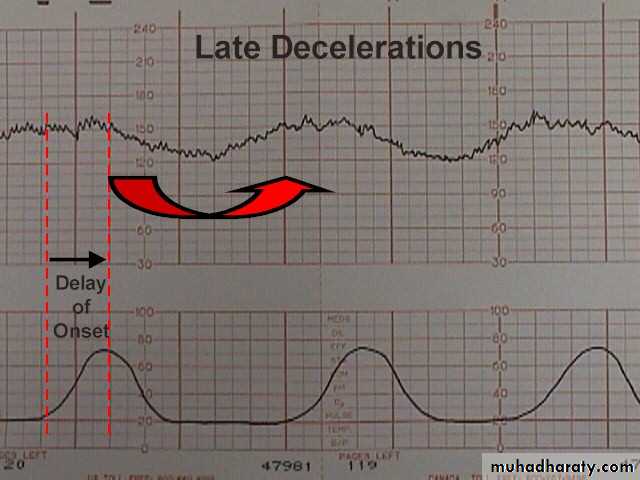 Late decelerations are indicative of a chemoreceptor-mediated response to fetal hypoxia (due to reduction in O2). Causes: