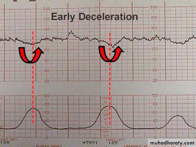 Decelerations that are shallow, short-lasting and are coincident with contractions. They are believed to be caused by vagal stimulation from fetal head compression (physiological) and do not indicate fetal hypoxia\acidosis.