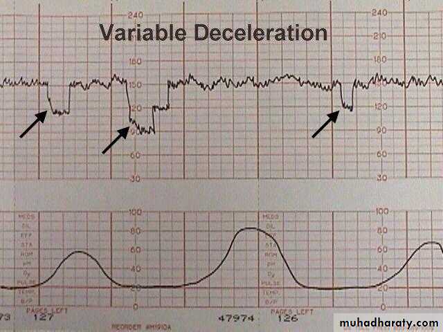 decelerations that exhibit a rapid drop, rapid recovery to the base line, varying in size, shape, and relationship to uterine contractions.Variable decelerations constitute the majority of deceleration during labor attributed to umbilical cord compression:- (oligohydramnios, true knot, cord prolapse, cord around the neck, and cord entanglement)