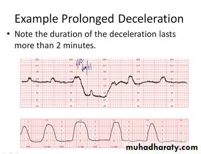 Prolonged decelerations:An isolated deceleration greater than 15 bpm lasting more than 2 minutes but < 10 minutes. These are likely indicate hypoxemia\acidosis, and require emergent intervention.