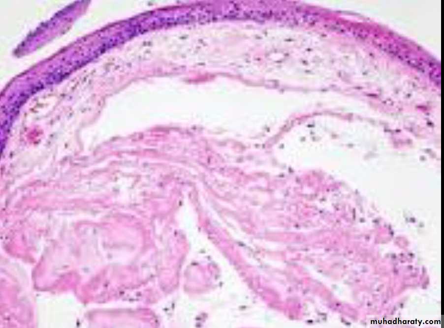 Histologically typically covered by squamous epithelium and core of the nodule is a loose myxoid connective tissue that may be fibrotic some time have numerous vascular channels.
