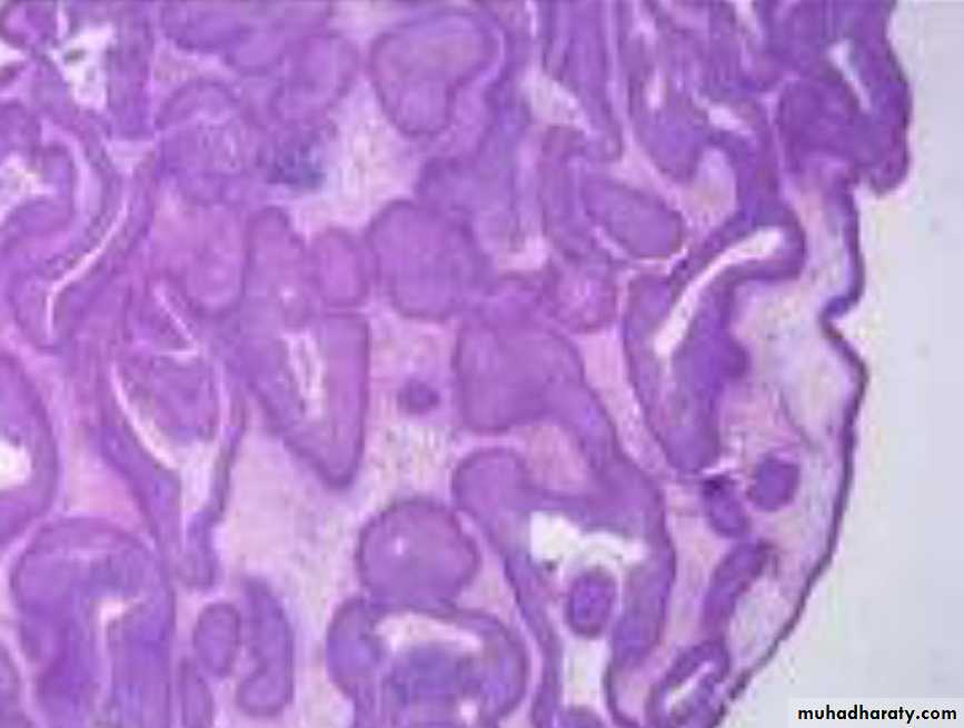 Histologic examination, the papillomas are made up of multiple slender, finger-like projections supported by central fibrovascular cores and covered by an orderly stratified squamous epithelium.