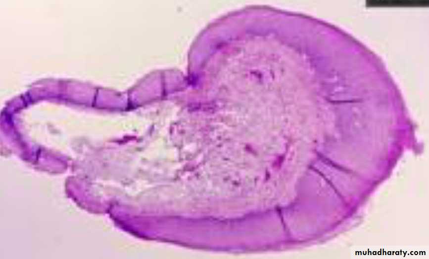 Gross . nodules are smooth, rounded, sessile or pedunculated , generally only a few millimeters in the greatest dimension, located usually on the true vocal cords.
