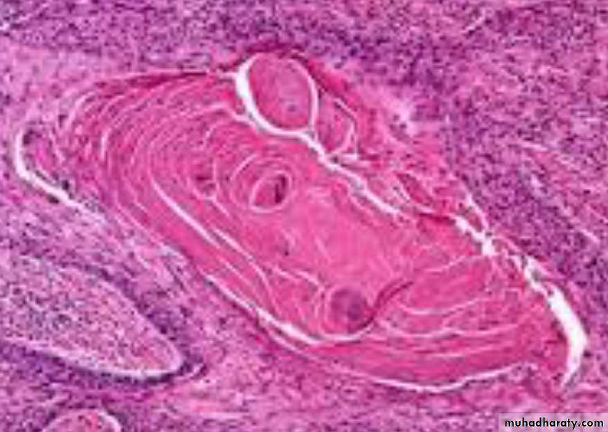 On histologic examination, the keratinizing and nonkeratinizing squamous cell lesions resemble usual well-differentiated and poorly differentiated squamous cell carcinomas arising in other locations.The undifferentiated variant is composed of large epithelial cells with oval or round vesicular nuclei, prominent nucleoli, and indistinct cell borders . Admixed with the epithelial cells are abundant, mature, normal-appearing lymphocytes, which are predominantly T cells.