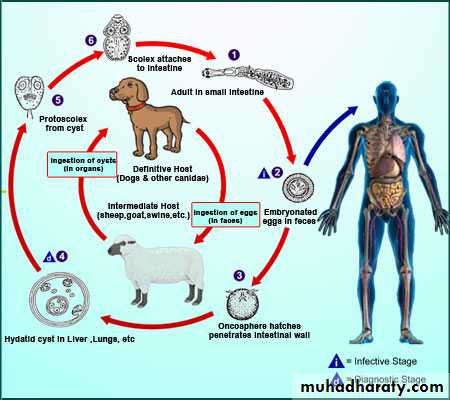 renal hydatids occur in only about 2% of casesThe hydatid is the larval form of Echinococcus granulosus,whose definitive host is the dog, and whose principal intermediate host is the sheep.