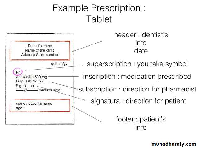 Superscription: It consists of Latinsymbol Rx meaning take thau or you take.
