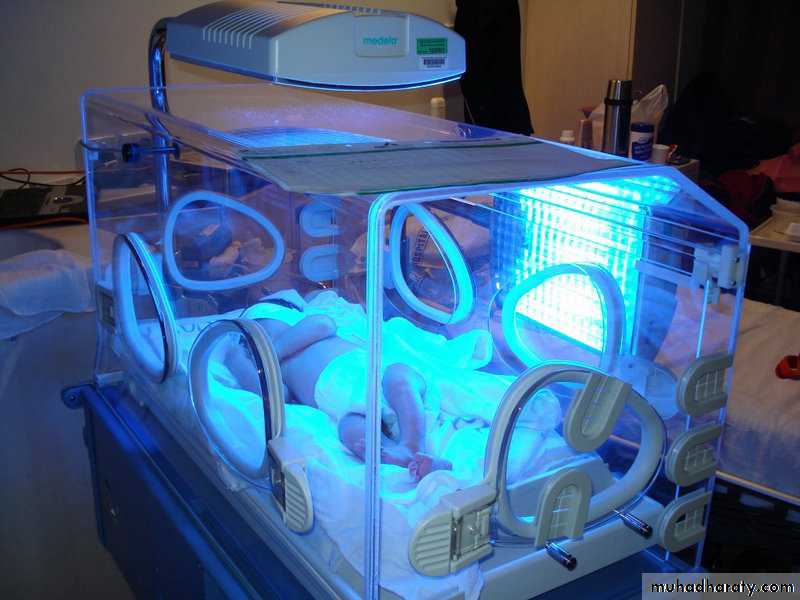 Clinical jaundice & indirect hyperbilirubinemia reduced onexposure to a high intensity of light in a wave length of