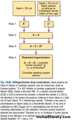 Appropriate lifestyle measures may obviate the need for drug therapy in patients with borderline hypertension, reduce the dose and/or the number of drugs required in patients with established hypertension, and directly reduce cardiovascular risk. Correcting obesity, reducing alcohol intake, restricting salt intake, taking regular physical exercise and increasing consumption of fruit and vegetables can all lower BP. Moreover, quitting smoking, eating oily fish and adopting a diet that is low in saturated fat may produce further reductions in cardiovascular risk.Emergency treatment of accelerated phase or malignant hypertension In accelerated phase hypertension, lowering BP too quickly may compromise tissue perfusion (due to altered autoregulation) and can cause cerebral damage, including occipital blindness, and precipitate coronary or renal insufficiency. Even in the presence of cardiac failure or hypertensive encephalopathy, a controlled reduction to a level of about 150/90 mmHg over a period of 24–48 hours is ideal. In most patients, it is possible to avoid parenteral therapy and bring BP under control with bed rest and oral drug therapy. Intravenous or intramuscular labetalol (2 mg/min to a maximum of 200 mg), intravenous glyceryl trinitrate (0.6–1.2 mg/hr), intramuscular hydralazine (5 or 10 mg aliquots repeated at halfhourly intervals) and intravenous sodium nitroprusside (0.3–1.0 µg/kg body weight/min) are all effective but require careful supervision, preferably in a highdependency unit.