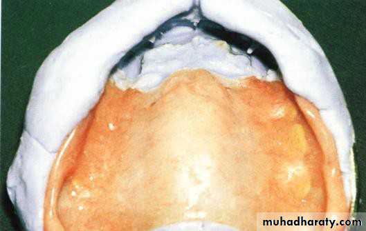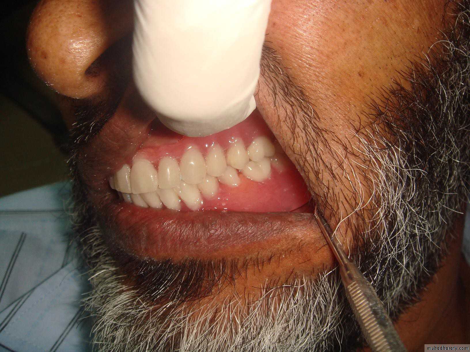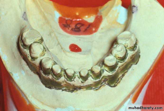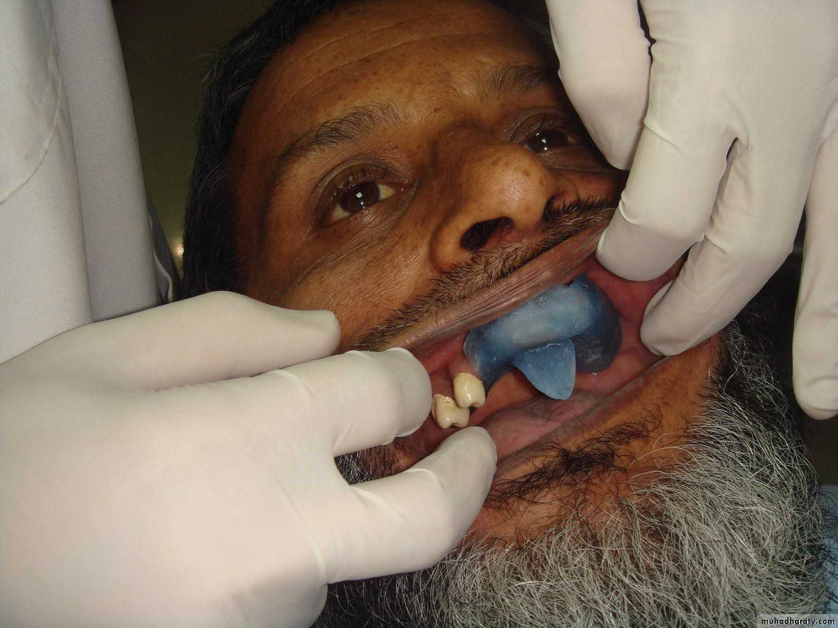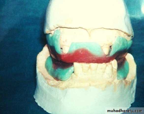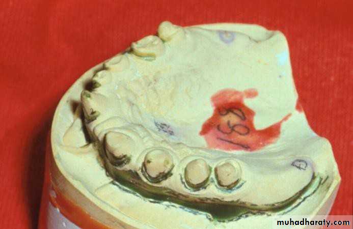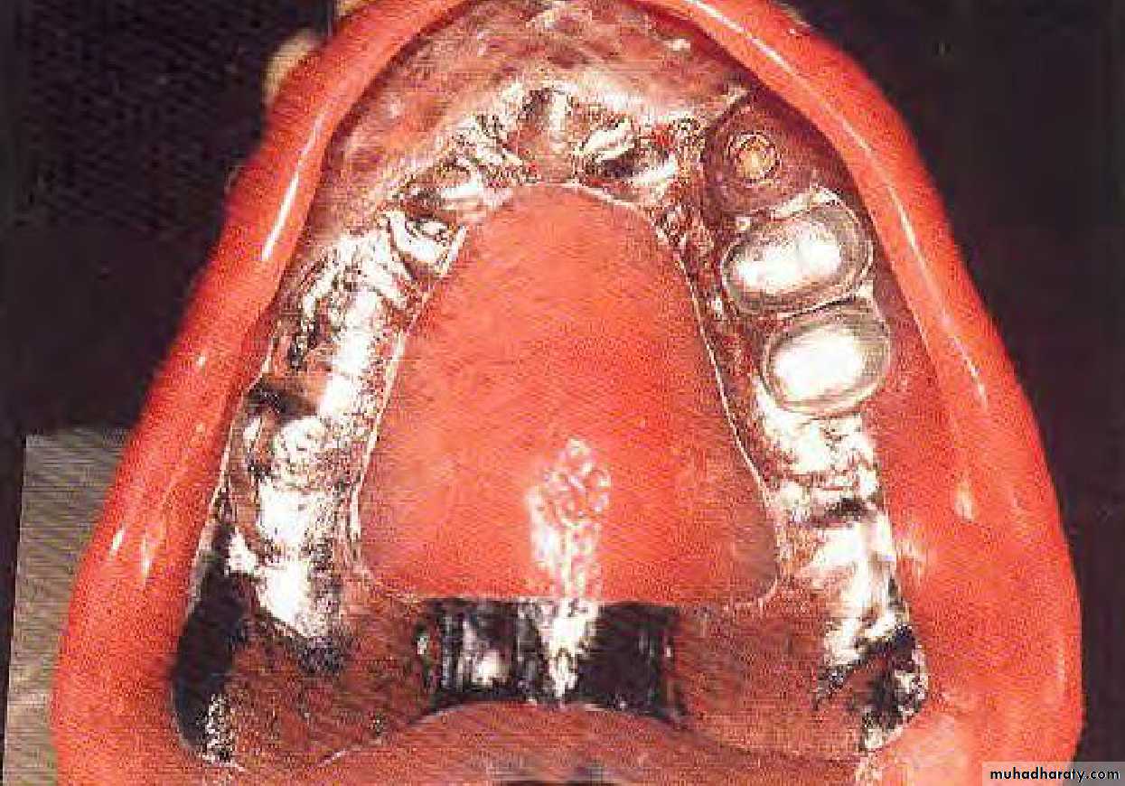 • When the processed denture is fitted, it is relined with cold cured acrylic in the areas around the abutment teeth to make it fit as well as possible.