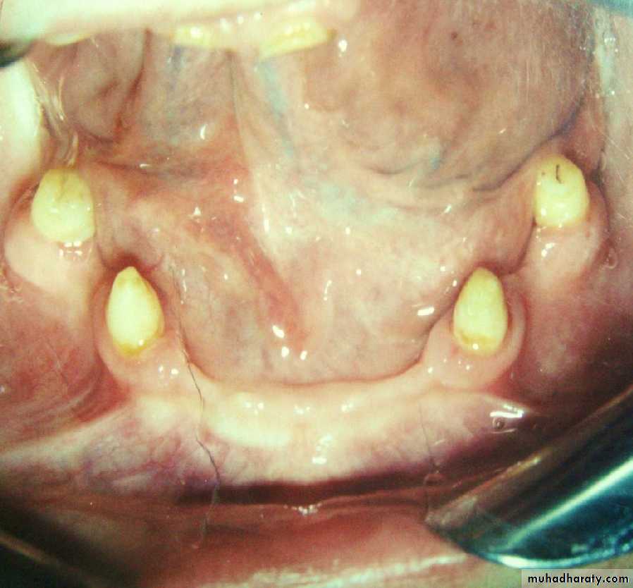 • 1) Few remaining teeth or teeth with an unfavourable distribution in the arch which precludes treatment with a removable P.D.