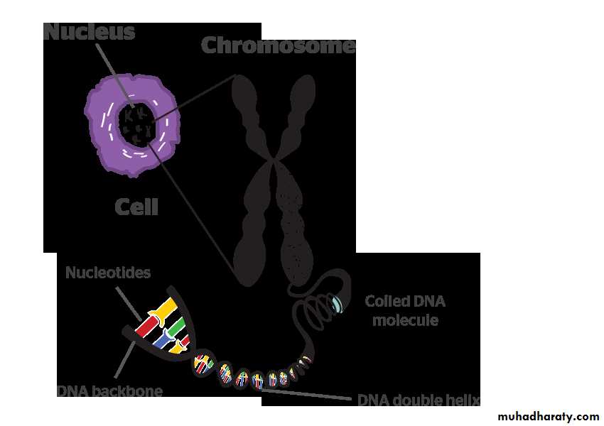 Heredity is the transmission of information required to construct multiple proteins. These proteins have diverse roles and different subsets, they are utilized by different cell types but all are encoded in the cells DNA which is organized into discrete structures called chromosomes.Chromosomes: every cell nucleus contains a set of chromosomes. Each chromosome consists of a single molecule of DNA (deoxyribonucleic acid) together with associated acidic and basic proteins.