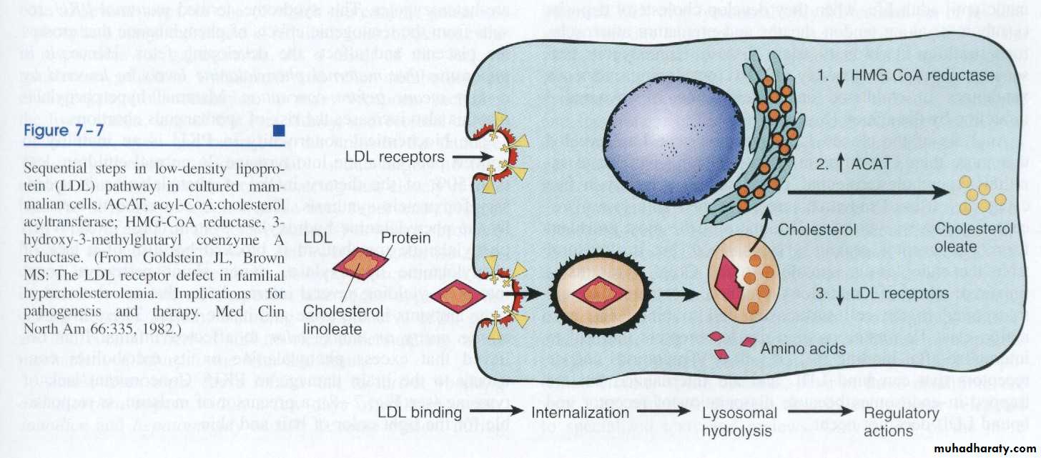 Example of the second is AD familial hypercholesterolemia [] disease where the receptors for LDL are mutated. They are responsible for regulation of LDL in the cells and the circulation. To explain the latter example and how the action of this pathway is executed, let us consider the pathway of circulating LDL: usually it should enter the cells of the body for building cellular membranes and nuclear membranes to replace the old ones that are affected by wear and tear. LDL could not enter the cells unless it is complexed with receptors on the cell membrane. Once it is inside the cell, the complex will be degraded into free cholesterol and amino acid. The latter is the remnant of the proteinaceous coat of the lipoprotein. The free cholesterol in the cell constitutes the cholesterol pool of the cell and its level is regulated by three systems of enzymes, the HMG-CoA reductase, which forms cholesterol from fatty acids, ACAT, which hydrolyzes cholesterol into esters and thus rendering it inactive and the number of the receptors on the surface of the cell. If the pool concentration is low, messages are sent to activate the HMG-CoA, to inactivate ACAT and increase the number of receptors on the cell surface. Therefore, when one of the two alleles responsible for the formation of the receptor protein becomes mutated, half of the number of receptors are formed only, so 50% of LDL which is used to be internalized inside the cell will remain in the circulation unable to enter the cells and a state of hypercholesterolemia results with reading of 400-500 iu/dl of cholesterol in the blood (normal value 180-220 iu/dl)
