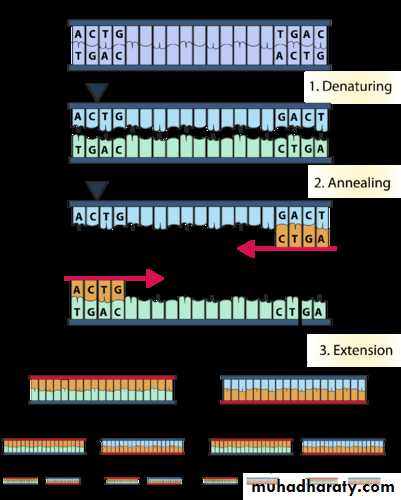 PCR is the most frequently used molecular technique in a molecular pathology laboratory. Using a pair of priming complementary sequences (oligonucleotide primers) flanking a location of interest, together with unique heat-resistant polymerases (DNA copying enzymes), multiple copies of a targeted chimeric gene can be obtained Each PCR cycle involves 3 basic steps: denaturing, annealing, and polymerization. During denaturing, the 2 strands of the helix of the target genetic material are unwound and separated by heating at 90° to 95°C. During annealing, or hybridization, oligonucleotide primers bind to their complementary bases on the single-stranded DNA. This step requires a much cooler temperature, 55°C. Finally, during polymerization (at 75°C), the polymerase reads the template strand and quickly matches it with the appropriate nucleotides, resulting in 2 new helixes consisting of part of the original strand and the complementary strand that was just assembled.The process is repeated 30 to 40 times, each cycle doubling the amount of the targeted genetic material. At the end of the PCR procedure, millions of identical copies of the original specific DNA sequence have been generated.