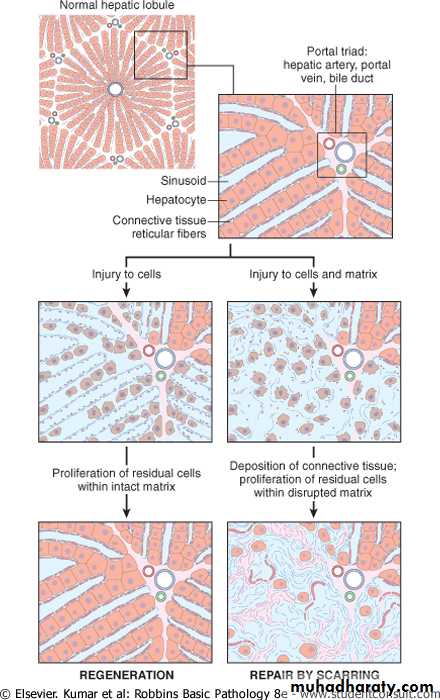 Regeneration:- complete restitution of the damaged components of the affected tissue i.e. the tissue essentially return to normal state.